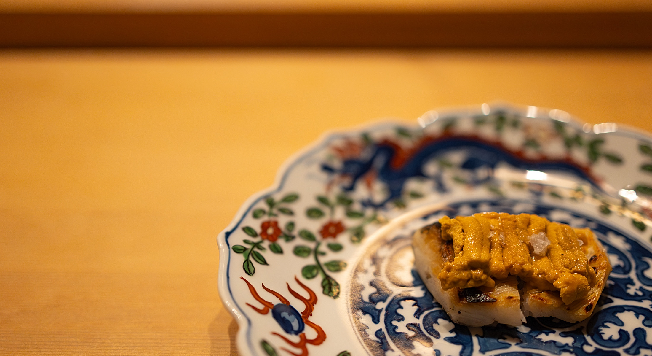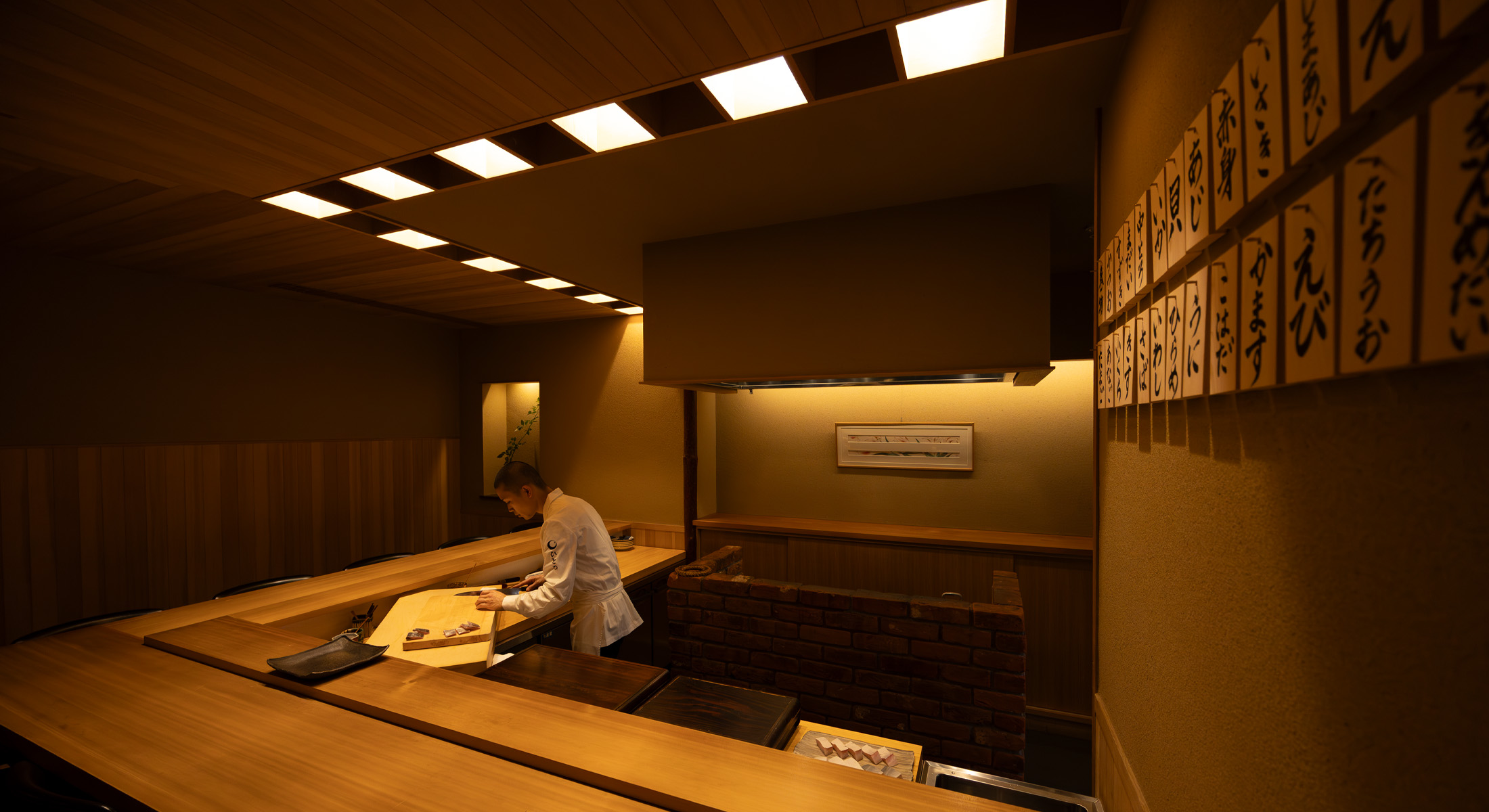 we have created a calm and inviting atmosphere, with a prominent brick grill at the center. Surrounding the grill is an L-shaped counter, allowing the guests to enjoy the live cooking experience of both cooked dishes and sushi right in front.